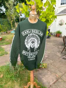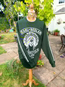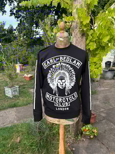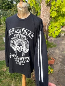 Long sleeved go-faster striped 100% organic cotton round neck tee bearing a large silk screen printed graphic of the Earl of Bedlam Motorcycle Club emblem.