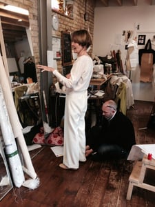 Secondly we have actress-comedienne Joanna Neary, in a tweed pair and then her summer cotton version. Vintage buttons are used where appropriate to personalise and rarify.